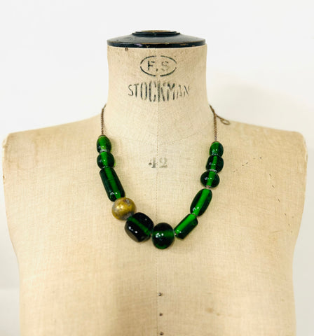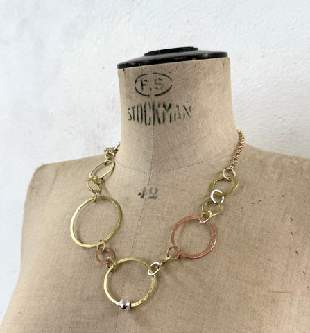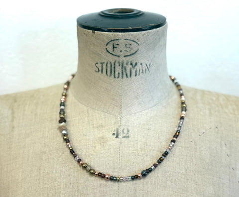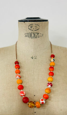Long necklace, combination of copper, brass, semi-precious and glass beads with 3 V&M handmade spacer shapes of copper or brass. Can be worn long or doubled short. Available in many other colour options; if you'd like a different colour, when you place your order contact Wendy 0410 116347 to confirm your colour request.
