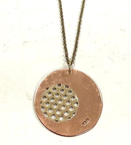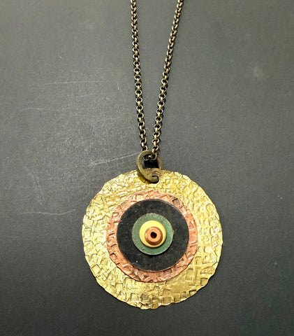 Double hoop and stem brass pendant made from recycled brass (largest circle approx. 6cm across), supplied on brass chain, approx. 70cm length. Handmade in Braidwood, all hoops are soldered for strength and durability, with a V&M Lifetime Guarantee. Approx. 8cm length pendant. Also available in copper and silver.