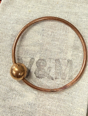 Thin recycled copper bangle with brass barrel bead. Available in small (approx. 6cm), medium (approx. 6.5cm) or large (approx. 7cm) size. Supplied with cord so it can also be worn as a pendant. Also available in brass and silver. V&M Lifetime Guarantee.